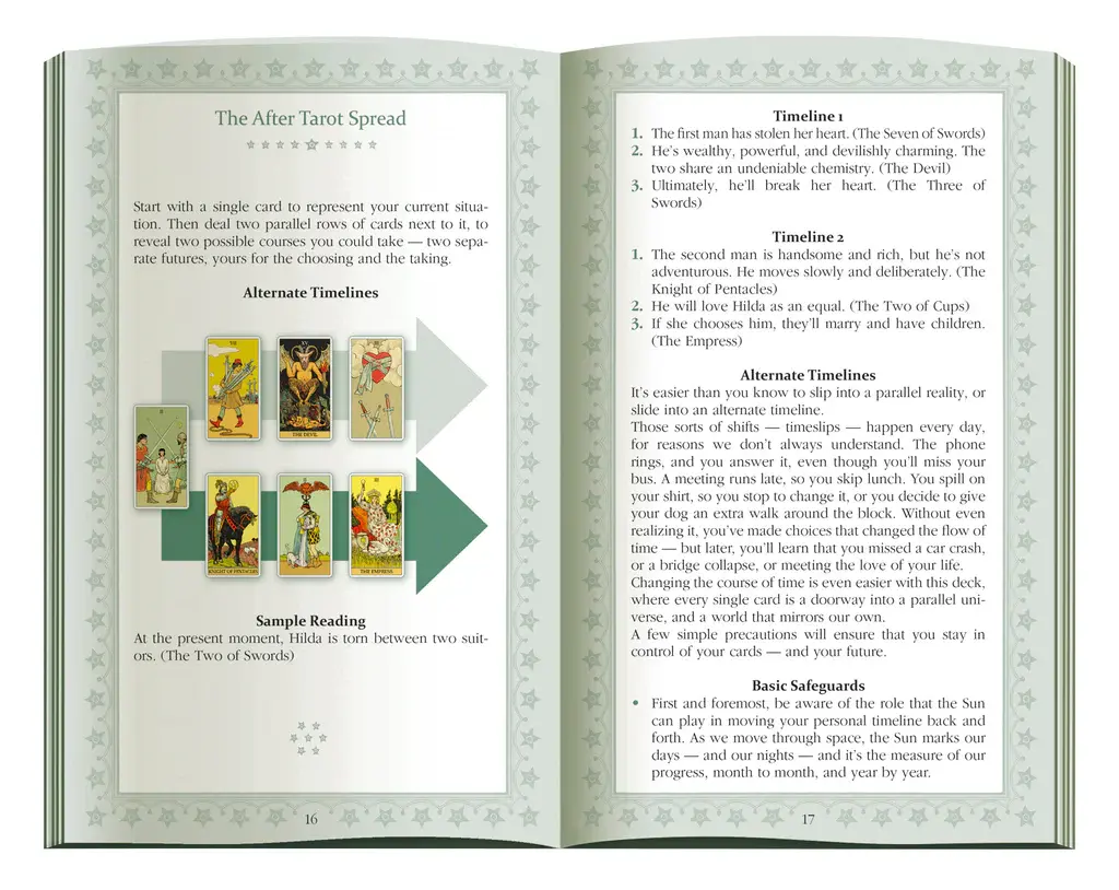 Elke kaart toont de voortzetting van het verhaal. Wat gebeurt er met De Dwaas nadat hij een stap verder zet? Hoe ontwikkelt de energie van De Magiër zich nadat zijn intentie is uitgesproken? Door deze unieke benadering ontstaat een nieuw perspectief op oorzaak en gevolg, ontwikkeling en transformatie.
