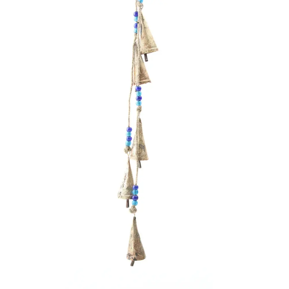 Onze muzikale bellen zijn gemaakt van messing. Met de speelse klank, schitterende blauwe en turquoise glaskralen, en algehele 'verweerde' look is dit koord perfect voor om een hintje van het zonnige strand in huis te brengen.