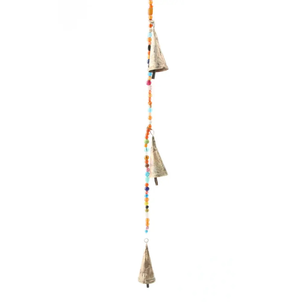 Aan het koord van ±100 cm hangen 5 belletjes met speelse kleurrijke glaskralen tussen elke bel van ±50mm. Het gewicht van het geheel is ±145 gram.