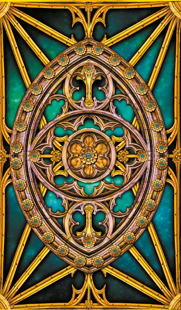 Zoals een glas-in-loodraam in een kathedraal het zonlicht vangt en transformeert, zo onthult dit tarotdeck het volledige levensbeeld wanneer het wordt geraakt door het symbolische goddelijke licht van de kaarten.
