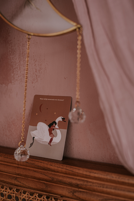 Deze kaarten zijn magische sleutels die nieuwe deurtjes in kinderen kunnen openen. Reis een stukje mee in de wondere wereld van kinderen, waarin ze zelf hun eigen schatten mogen ontdekken. Creativiteit, fantasie, dromen en verlangens worden aangewakkerd waardoor de kunst van het manifesteren op jonge leeftijd geleerd mag worden. Op elke kaart staat een vraag. Trek elke dag een kaartje met je kinderen tijdens het eten of na school. Wat een mooie dierbare gesprekken zullen er ontstaan.